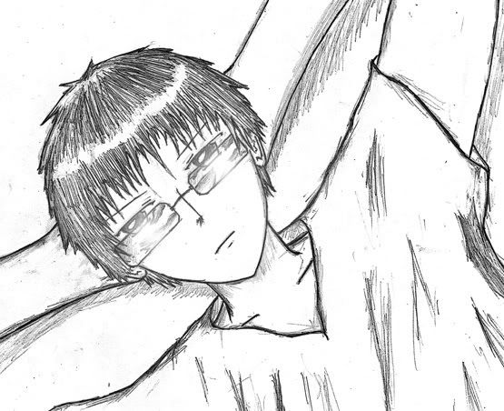 @nekomimi- hmm.. naw, its not a gunbox. its a paper bag. ._.; yknow those big ones you get from stores? ahahahahaha badly drawn, badly drawn. @angelus- hmm. i tried a different pen today. one of those.. less-inky solid-state pens. i'm not sure if thats what you meant by a pigment pen.. i drew todays drawing a bit fast, so its a bit messy. and mutated looking. but i would like to hear your comments on the shading.. er not exactly shading. the. err. thingummywhuts. =D @dragonfly- hmm~ i know cleanness is a usually good, but im trying to draw up on my skillz with detail =P my drawings lately look pretty bad dont they. oh well! eventually i might get to where i want to be. maybe. i can see why you're proud of that drawing =D thats what you mean by "clean" in b&w technique right? its a very nice effect. @rabbit- unyuu. thats what i get for trying weird perspectives. =P oh well! everything is an experiment. experimentation is good. ummmmm~ @roq- omg! q-ko-chan is super cutely drawn! "please board me.." "board you?" "i'll explain more fully... wait.. i'll take off my clothes and.." ZWTF! moè! the art style is really interesting, too! hahahahahaha! crap, i wanna read more. i'll try searching for it at some jap bookstore near my school =( also, thanks for your kind words... i will not fail... zettai!! @gacktlover- lol@falloutboy. interesting. the drawing looks very kon-like =P hmm. i thought i saw these round circles with "A" written in them at the bottom corners of your earlier posted drawings.. maybe i was mistaken ^-^;; *edit* hmm, i think it looks good? it looks right for a side profile, i think. sayyy.. are you called eureka because of eureka7? (lol!) @schala- nihaha is OUT! uguu is IN! ayu/naiyuki > misuzu!! <3 Kanon & Taiyaki @izumo- hmm.. do you usually look at an anime picture and draw? cos for some reason i cant draw characters other than my own without messing up the way they look pretty badly =P probably something to do with the huge gap in skill level u_u; your drawings are perfect, as always! unyuu... @imppy- ohohoho. i bet i eat more than you! i eat ridiculous amounts of food. really! but im NAT FAT EITHER. SO THERE!! @anyone whos willing to tell- what happened to izorue? does anyone have a link to teh forum post? wednesdays drawing. ![]() those were supposed to be clouds reflected in his glasses = ![]() |